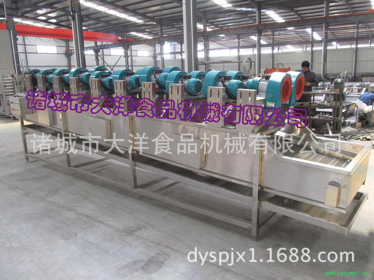 诸城市大洋牌全自动风干线适用于蔬菜制品等软包装产品灭菌后的除水工作,亦适用于蔬菜清洗后表面水的去除。通过多次翻身沥水,及上部高压强冷风吹,使软包装完全达到表面水珠吹干的效果(袋面皱纹间的存水也能干)。大洋食品风干机与杀菌机相连并速度同步。