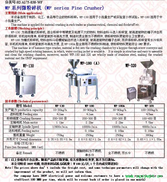 WF微粉碎机适用于制药、化工、食品等行业的微粉碎,适用于实验室及中小批量生产。该机结构简单,清洗方便,WF-180可根据客户的需要有普通机型与不锈钢机型。