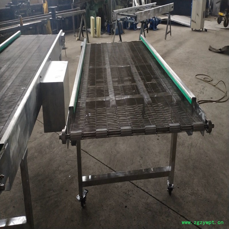 网带输送机多用于物料的多层输送晾干,采用不锈钢网带式作为载体,适用于各种食品操作行业的烘干、去湿、冷冻、热处理等步骤;网带输送机中的网带由不锈钢制成,网带本身具有耐高温、便于清洗等特点。网带输送机广泛应用于饮料瓶、铝罐、药品、化妆品、食品等行业的输送,通过选用不同的网带可以制作成储瓶台、提升机、杀菌机、蔬菜清洗机、冷瓶机以及肉食品输送等行业专用设备考虑网带承受拉力限制,单线长度一般不超过20米。结构形式有:水平直线输送、晋升爬坡输送、转弯输送等多种形式,输送带上还可增设晋升挡板、侧挡板等附件,能满足各种工艺要求。