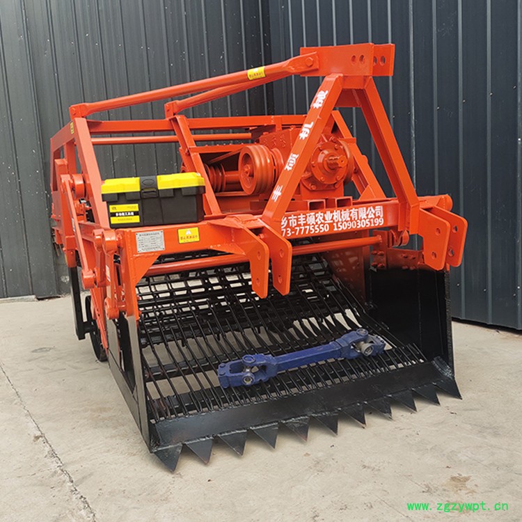 通过拖拉机后升降臂,中间拉杆连接固定收获机,调节好深度,然后开动机器,松土铲插土壤中,将药材的根茎从土壤中铲出,根茎连同土块进入振动筛上,对包裹药材根茎的土块进行振动操作,振动掉一部分土块。振动后的土块和药材根茎进入前传输带上,再漏掉一部分土块.在前传输带运输的过程中,前压辊可以把大的土块碾压成小的土块,再进入到后压棍组中,对小的土块进行进一步碾压,经过碾压处理后的土块和药材根茎进入后传输带上,压碎的土块经后传输带漏掉,后传输带将药材送入回收箱内,完成药材的收割回收。
