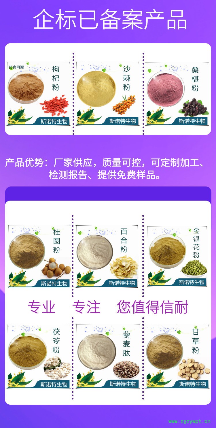 斯诺特生物科技公司主营:提取物比例产品、含量产品、生粉系列、多糖、果蔬粉、五谷杂粮粉,小分子肽粉。保健品原料、饲料原料、化妆品原料,植物提取物源头厂家,可根据客户要求定制生产,多规格供应。