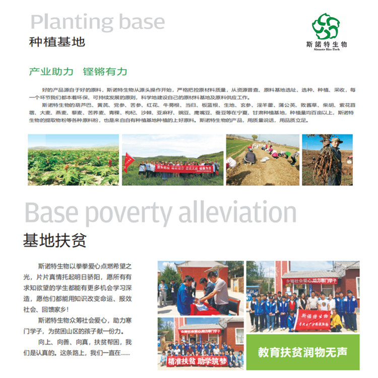 扶风斯诺特生物为了从源头控制产品质量,公司不断开辟扩大药材种植基地规模。现有种植黄芪,枸杞、苦参、败酱草,紫锥菊,独活,黄芪、柴胡,板蓝根,沙棘果,沙棘叶等40多种药材已经投入使用到生产中。从药用植物的种子、生长的环境、田间管理、收获、包装、仓储、运输及人员管理等有关细节做起,全程控制药材质量。
