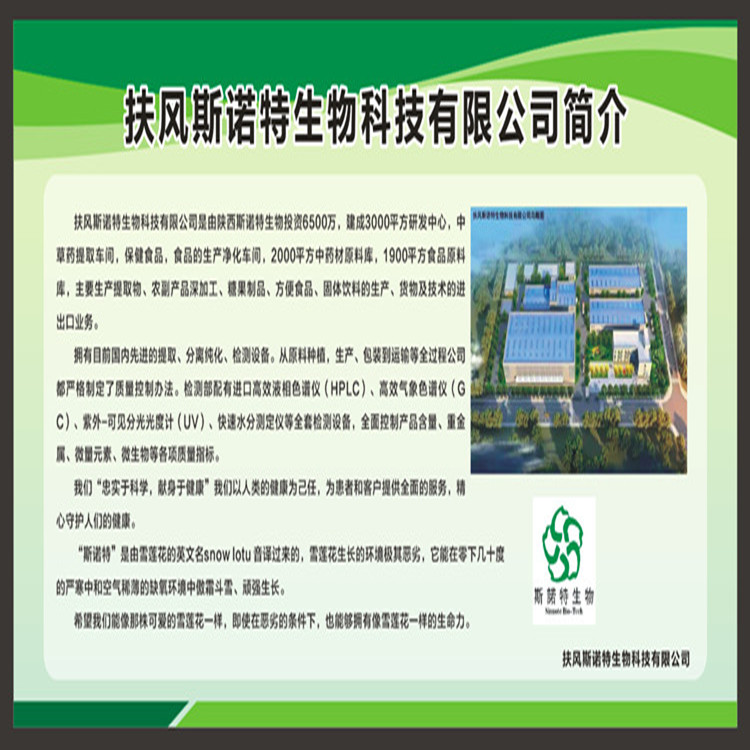 扶风斯诺特生物科技有限公司,主要从事各类植物提取物、药食同源,新资源食品,保健品原料,化妆品原料,果蔬粉,五谷杂粮粉,小分子肽的研发、生产、销售,与一体的公司。