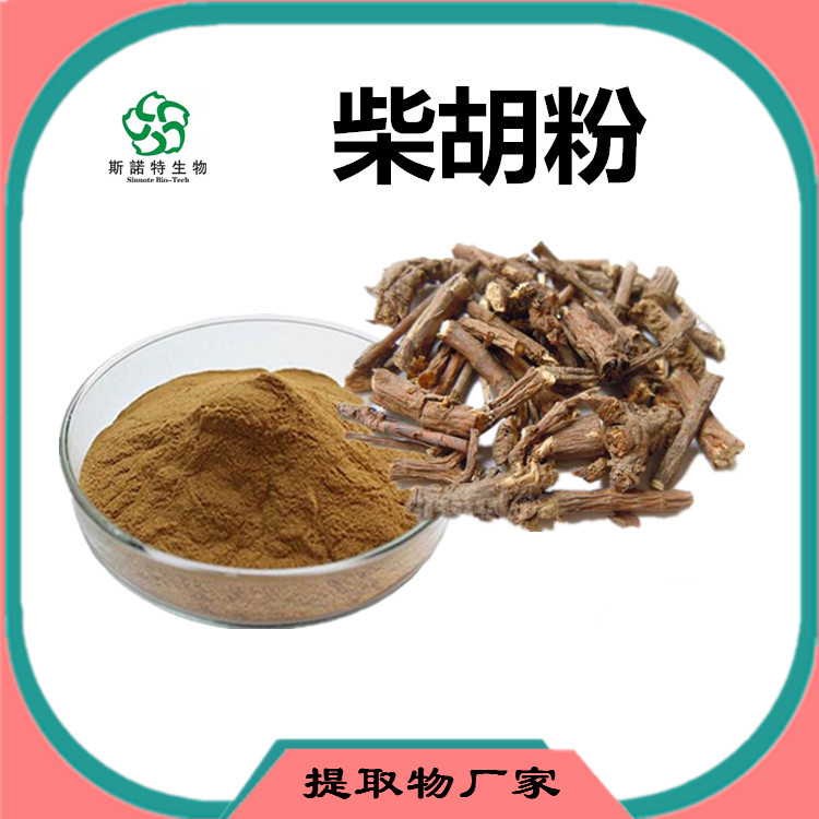 柴胡提取物系以柴胡为原料,经清洗,烘干后,装罐,以水为溶剂,加热回流提取三次,每次2小时,合并三次提取液,继续浓缩蒸发水至浸膏,喷雾干燥为柴胡提取物,经粉碎,过80目筛,混合包装,即得。