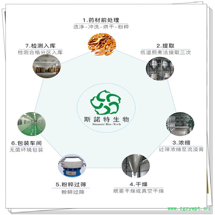 【生产工艺】精选原料、清洗原料、3遍提取、浓缩、喷雾干燥成粉、过筛 、包装。