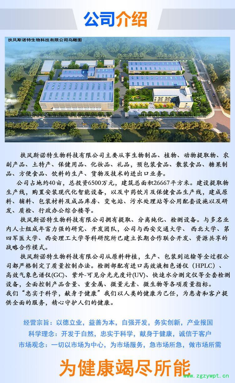 提取物类:丹参提取物、淡竹叶提取物、当归提取物、地肤子提取物、杜仲提取物、煅龙骨提取物、莪术提取物、非洲仙人掌提取物、佛手提取物、茯苓皮提取物、附片提取物、茯神提取物、浮小麦提取物、公丁香提取物、桂花提取物、龟板提取物、贯众提取物、仙人掌提取物、海金沙提取物、海藻提取物、黑豆提取物、黑木耳提取物、黑芝麻提取物、红花提取物、琥珀提取物、滑石提取物、黄精提取物、黄连提取物、鸡内金提取物、姬松茸提取物、建曲提取物、降香提取物、韭菜籽提取物、橘核提取物、橘红提取物、橘叶提取物、款冬花提取物、昆布提取物、葵花籽提取物、莲肉提取物、龙胆草提取物、龙葵提取物、漏芦提取物、路路通提取物、芦荟提取物、芦荟粉提取物、鹿衔草提取物、鹿茸提取物、大枣提取物、薏仁提取物、紫苏提取物、沙棘提取物等