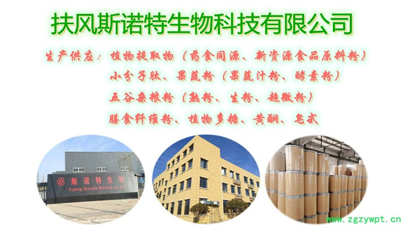 扶风斯诺特生物科技有限公司是一家专业从事天然植物有效单体和有效成分开发研究、提纯加工、工艺转让,技术合作的高新技术企业,产品主要有药食同源粉、新资源食品原料粉、动植物提取物、果蔬粉、五谷杂粮粉、小分子肽、各种植物单体(多糖、黄酮、皂甙、多酚),产品主要用于食品、饮料、保健酒、保健品、化妆品、特医食品、特膳食品等行业。