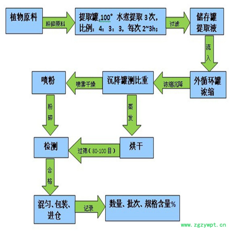 姜黄提取物工艺流程:精选原料→清洗→烘干(晒干,脱干,阴干)→粉碎→投料→水提取(酒精提取,其他溶剂提取)→3次提取液精滤→减压浓缩(常压浓缩)→再浓缩→流浸膏→喷雾干燥→粉碎→混合→过筛→检测→包装