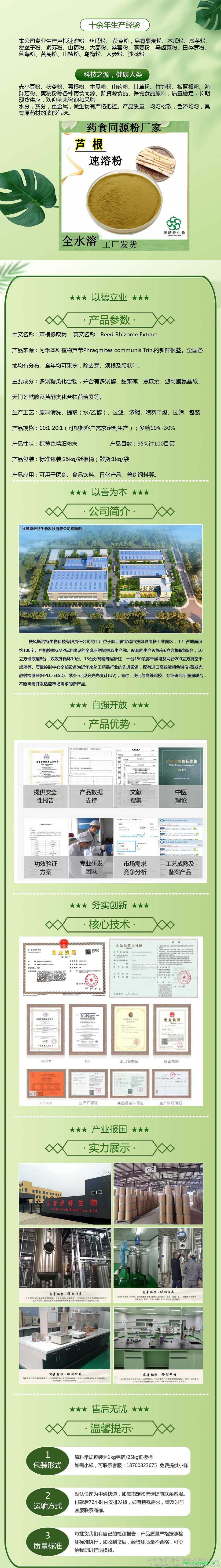 扶风斯诺特生物专业生产芦根提取物(芦根粉),自有生产工厂,厂家资质齐全(SC认证,企标,三方检测报告),可免费提供芦根提取物样品用于客户产品调试,随货带芦根提取物检测报告。
