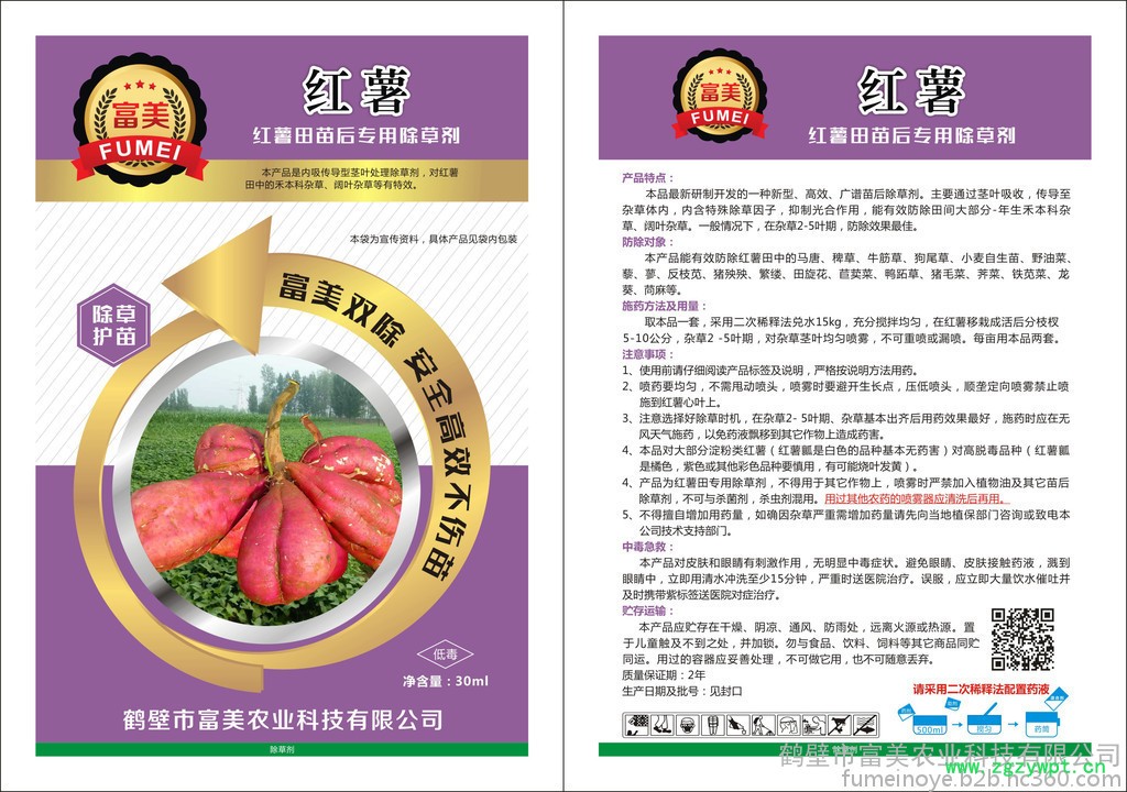 4、产品为红薯田专用除草剂,不得用于其它作物上,喷雾时严禁加入植物油及其它苗后