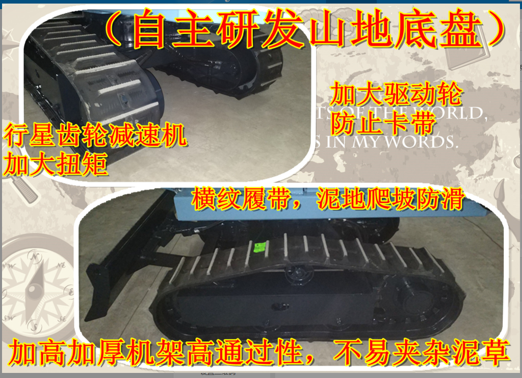 底盘部分采用双层加重型支重轮,承载力可达到4吨,牵引5吨载重的车斗,横纹防滑橡胶履带适用于泥土路况,加大扭矩的马达性能良好。