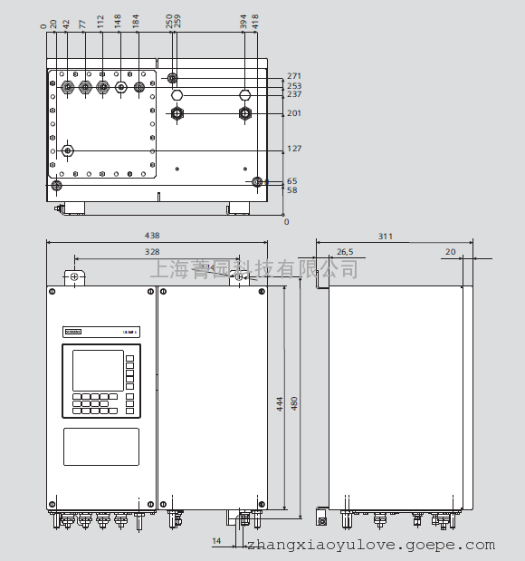现场式* 2 扇门式机箱(IP65),分析仪的分析部分和电子部分做到气密隔离,可吹扫* 左,右机箱可分别吹扫* 气路和管线接头材质为不锈钢(牌号:1.4571)或哈氏合金 C22* 吹扫气连接:管径为 10 mm 或 3/8"* 样气输入和输出口以及参比气的气路连接:内螺纹 1/8"-27 NPT* 带封闭型或流通型参比气室西门子CALOMAT62气体分析仪现场式尺寸: