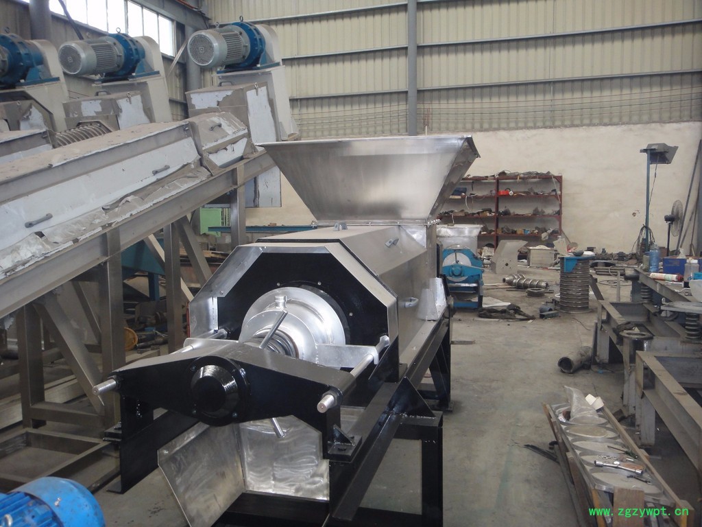 该设备主要有机架、送料部分,压榨部分,传动部分,电控部分组成,具备强度高,承载压力大,不变形、不易堵塞、耐腐蚀、耐磨损、不打滑、维修方便、使用寿命长等特点。螺旋既有输送螺旋和压榨螺旋做反向旋转的双螺旋、也有带有强力进料装置和止退装置的单螺旋(分进料螺旋、压榨螺旋、挤压螺旋三部分)、也有螺距、轴径和筛筒直径有变化的单螺旋,更有并联的左右相互交叉作反向旋转的双螺旋,根据不同物料和产量来选择不同的螺旋形式。该设备可单机使用,也可以多台串联使用,效果更好。出渣口通过调节弹簧压力或者油压可改变对物料的施压效果,从而调整排渣的干湿程度,其压榨效果因物料不同会有一定差别。
