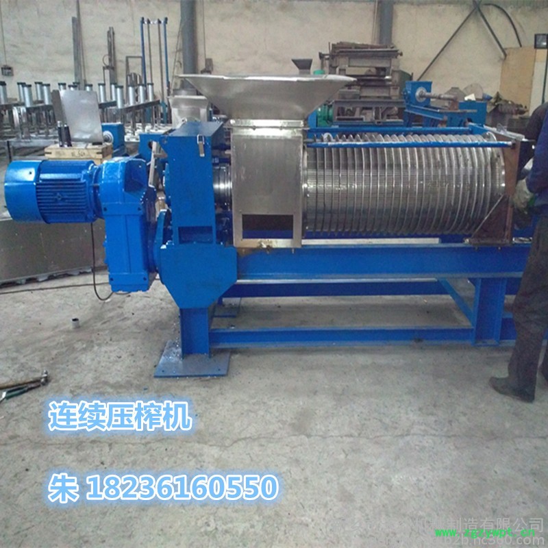本为螺旋式压榨,工作过程是:输送螺旋将进入料箱的物料推向压榨螺旋,通过压榨螺旋的螺距减小和轴径增大,并在筛壁和锥形体阻力的作用下,使物料所含的液体物(果汁)被挤压出,挤出的液体从筛孔中流出,集中在接汁斗内,压榨后的果渣,经筛筒末端与锥形体之间排出机外,锥形体后部装有弹簧,通过调节弹簧的预紧力和位置,可改变排阻力和出渣口的大小,用来调节压榨的干湿程度。