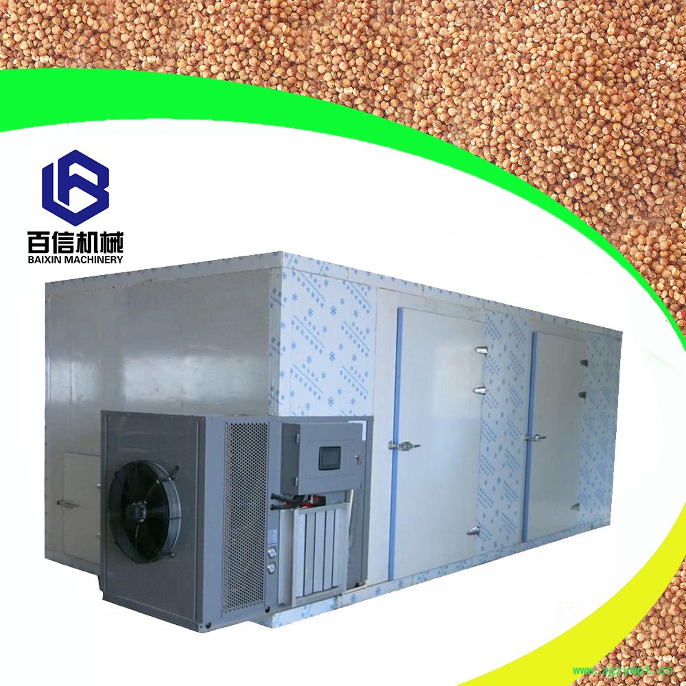 百信高粱烘干机是一种热量提升装置,空气能热泵烘干机组利用逆卡诺原理,从周围环境中吸取热量,并把它传递给被加热的对象(温度较高的物体),主要应用于食品,药材,木材,农副产品,工业品等的烘干脱水过程。