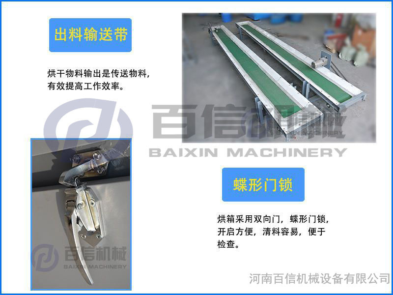 1、烘箱内外是采用不锈钢或彩钢材料,具有耐潮湿,耐腐蚀,强度高,不生锈等优点。 2、烘箱采用双向门,以利于检查,拆卸机件,开启方便,清料容易。