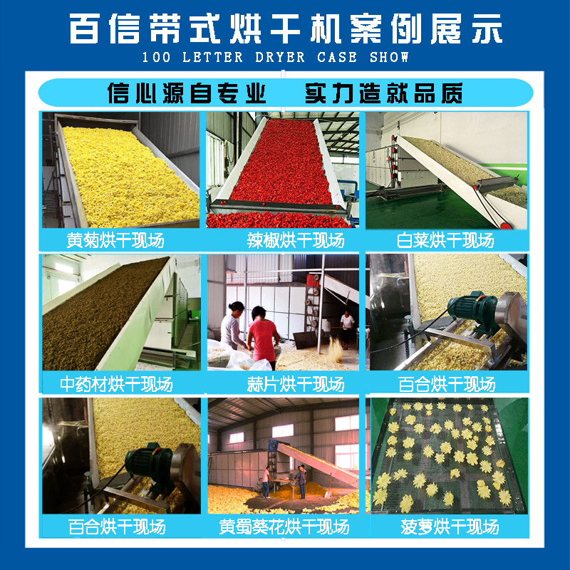 百信多层连续式麦冬烘干机脱水干燥迅速, 操作方便,效率运行。能满足大批量连续生产的需求,网带式干燥设备广泛应用于食品(如面条、面皮)、干果(大枣、巴旦木、腰果、开心果)、花茶(玫瑰花、红薯、金银花、山楂花)、农副产品(如玉米、红薯烘干袪潮)、脱水蔬菜(如大蒜、红薯、红薯、辣根、洋葱、白菜干、生姜、小香葱、辣根、菠菜)、瓜果(如红薯、薯片、红薯、葡萄干、哈密瓜)、中草药、(连翘、黄蜀葵、枸杞、)水产品、土特产品、饲料及化工原料等加工之片状、条状、块状和颗粒状物料的脱水干燥作业。