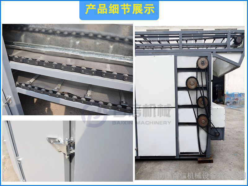 百信多层连续式烘干机脱水干燥迅速, 操作方便,效率运行。能满足大批量连续生产的需求,网带式干燥设备广泛应用于食品(如面条、面皮)、干果(大枣、巴旦木、腰果、开心果)、花茶(玫瑰花、山药、金银花、山楂花)、农副产品(如玉米、山药烘干袪潮)、脱水蔬菜(如大蒜、山药、山药、辣根、洋葱、白菜干、生姜、小香葱、辣根、菠菜)、瓜果(如山药、薯片、山药、葡萄干、哈密瓜)、中草药、(连翘、黄蜀葵、枸杞、)水产品、土特产品、饲料及化工原料等加工之片状、条状、块状和颗粒状物料的脱水干燥作业。