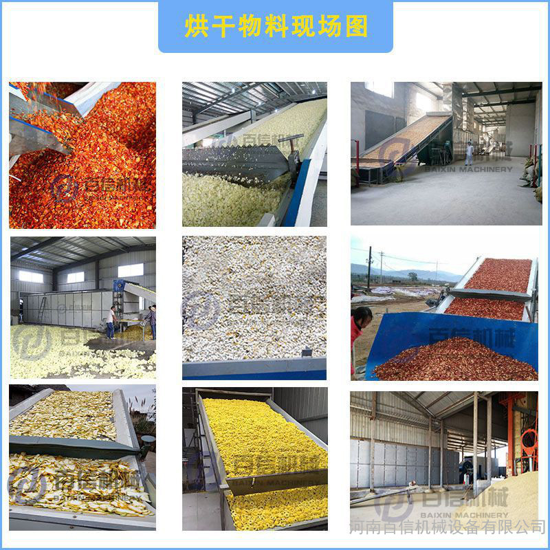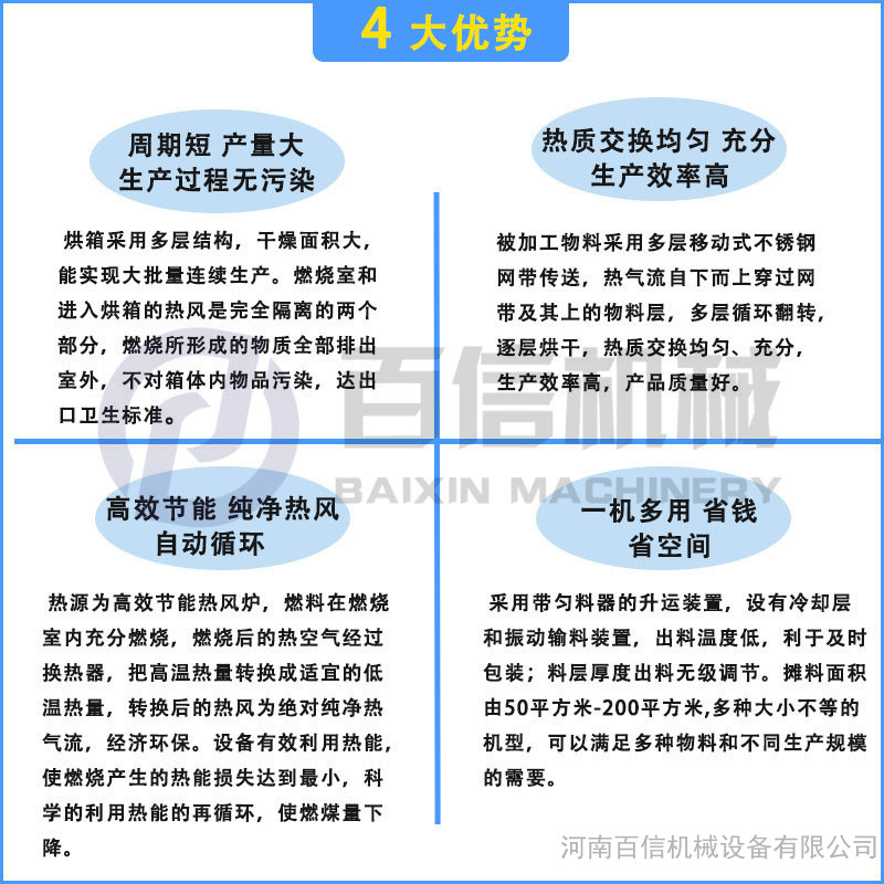 百信多层连续式烘干机脱水干燥迅速, 操作方便,效率运行。能满足大批量连续生产的需求,网带式干燥设备广泛应用于食品(如面条、面皮)、干果(大枣、巴旦木、腰果、开心果)、花茶(玫瑰花、山药、金银花、山楂花)、农副产品(如玉米、山药烘干袪潮)、脱水蔬菜(如大蒜、山药、山药、辣根、洋葱、白菜干、生姜、小香葱、辣根、菠菜)、瓜果(如山药、薯片、山药、葡萄干、哈密瓜)、中草药、(连翘、黄蜀葵、枸杞、)水产品、土特产品、饲料及化工原料等加工之片状、条状、块状和颗粒状物料的脱水干燥作业。