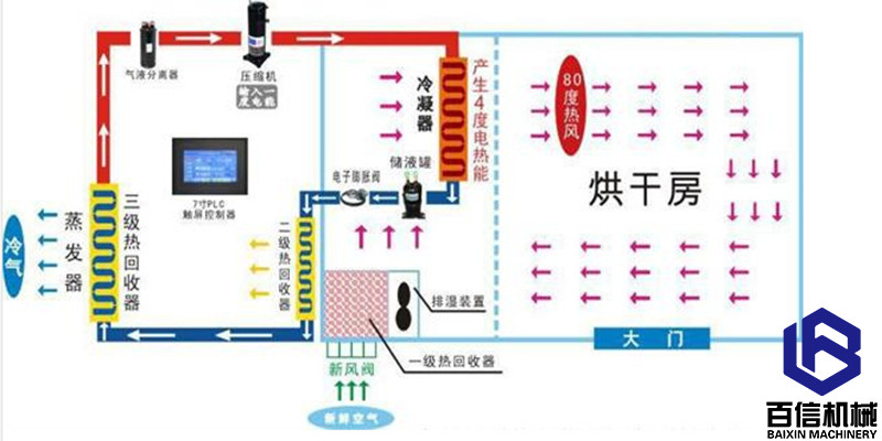 1.主机(加热系统):利用输入很少的电能吸收空气中的免费热量,用来烘干物料。