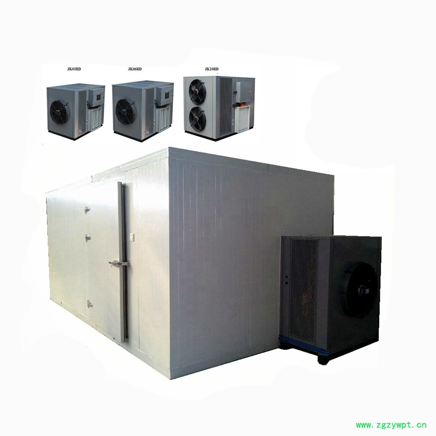 依靠电能吸收空气中的免费热量并将其转移到烘干房内(输入1度电能量能产生4度电热能),实现烘干房温度提高,配合相应的除湿设备实现物料的干燥。