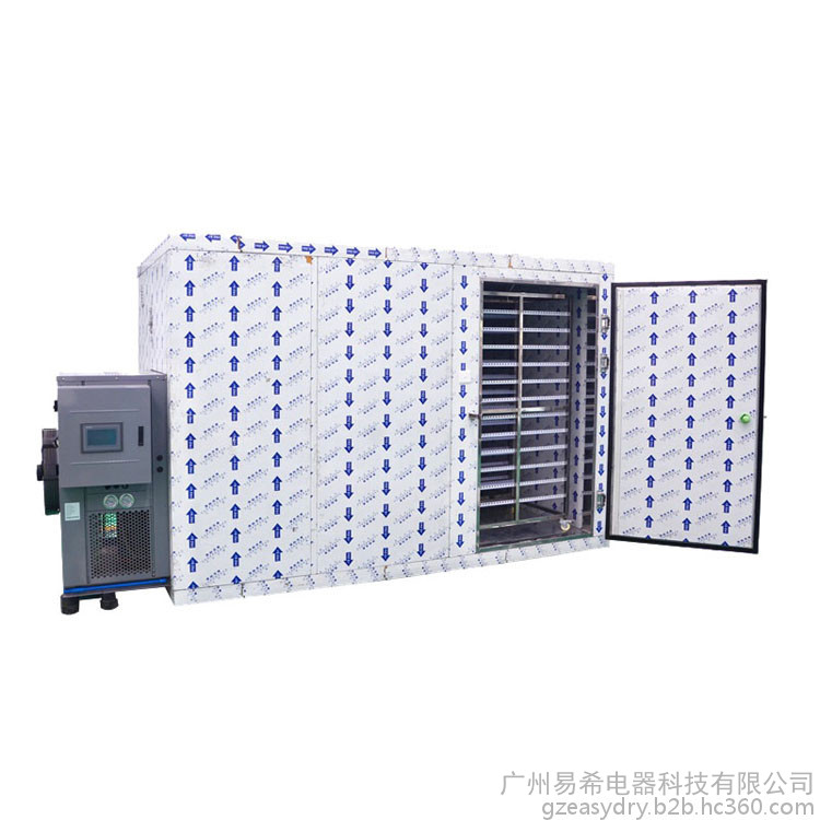 依靠电能吸收空气中的免费热量并将其转移到烘干房内(输入1度电能量能产生4度电热能),实现烘干房温度提高,配合相应的除湿设备实现物料的干燥。