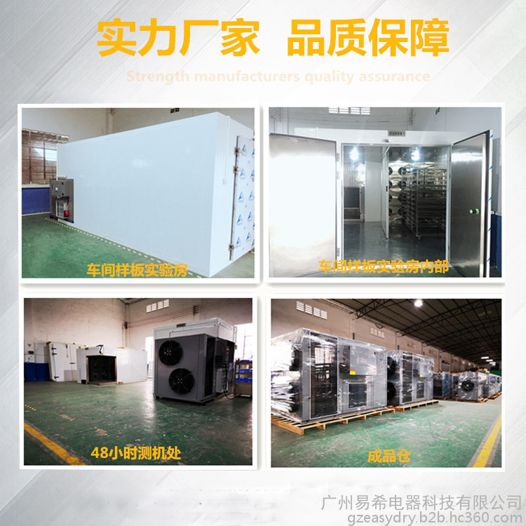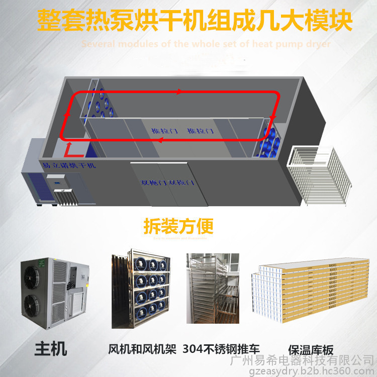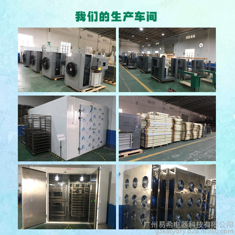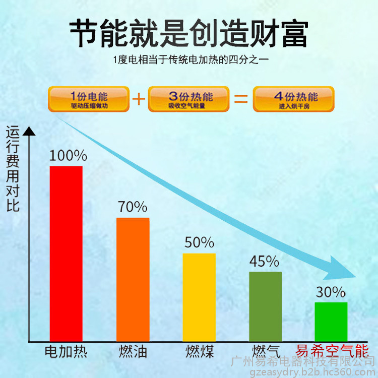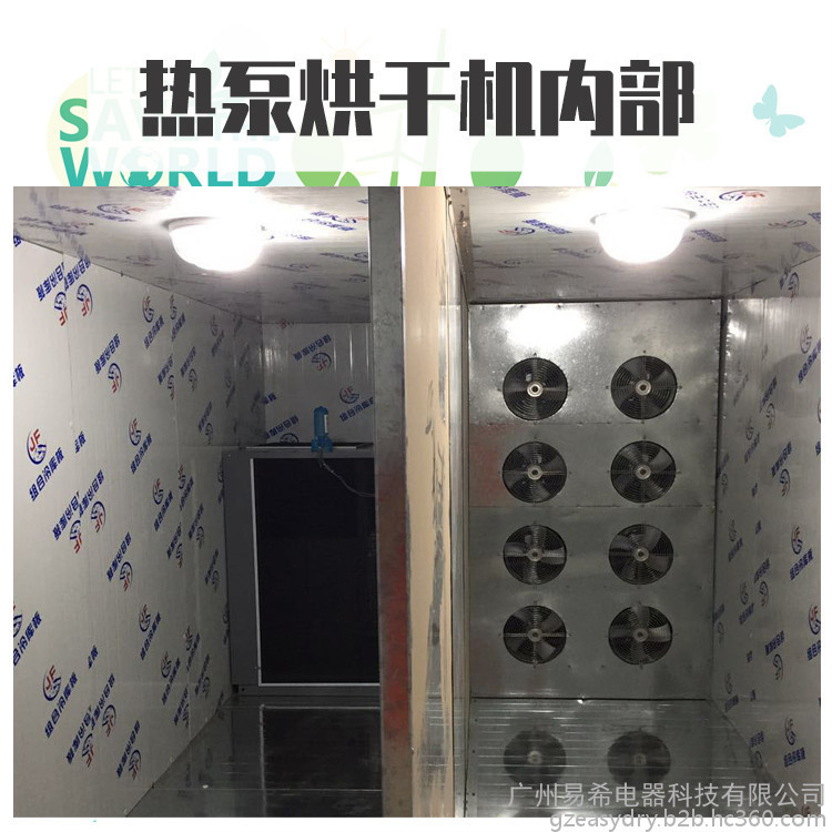 依靠电能吸收空气中的免费热量并将其转移到烘干房内(输入1度电能量能产生4度电热能),实现烘干房温度提高,配合相应的除湿设备实现物料的干燥。