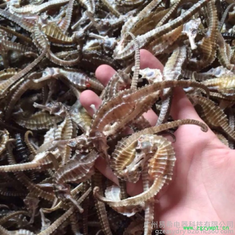将海马放在淡水中,清洗干净,浸泡一段时间后,洗刷去体表灰黑色的皮膜,剖腹去掉内脏,将尾盘卷起,直接在太阳下晾晒或使用我们的海马烘干机批量烘干。制干后的海马用包装好即为成品。