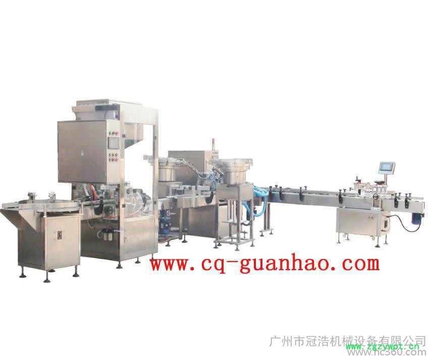 2、本线采用送瓶机、10头自流式灌装机、直线式旋盖机、圆瓶贴标机组成全自动化生产线。