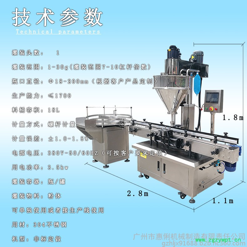 该机是一款经济适用的粉末及小颗粒自动灌装机,能完成瓶子自动定位,充填及计量等工作,该机由一个充填头,一台链板输送带及一个定位装置组成,采用伺服﹙或步进﹚马达,PLC及触摸屏控制,操作简便,稳定性高。可与理瓶机、旋盖机、贴标机等组成整套灌装流水线。适用于包装粉末及小颗粒物料,如粉剂、小颗粒剂药品、兽药、葡萄糖、调味品、固体饮料、碳粉、爽身粉、农药等。