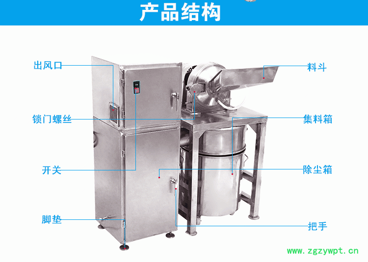 接由主机磨腔中排出、粒度大小通过更换不同孔径的网筛获得,另外该机为全不锈钢。机壳内壁全部经机加工达到