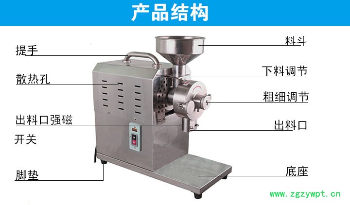 (一)、不锈钢小型五谷杂粮磨粉机。该机由不锈钢精加工而成,配用双值电容异步电动机,动力强劲。