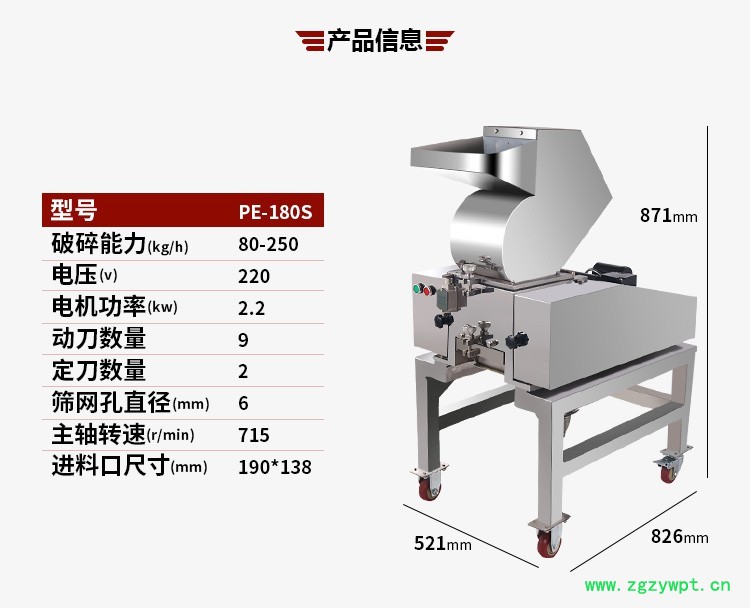 适用于医药、化工、食品、饲料等行业的物料加工。尤其适用于中药中坚硬,难粉碎的物料。如坚硬的根类,成捆的草、藤类,大块状类以及各种角类的粗碎加工。草类(如伸筋草)、藤类(如鸡血藤)、根茎类(如降香、香橼、刺五加、金荞麦、板蓝根、干白芍等)、矿石类(如磁石、寒水石、龙骨、含铁的矿石)、果壳淀粉类(如泽泻、土茯苓、猪苓)、强纤维类(如灵芝、干姜)、蓬松状类动物壳(如桑螵峭)等物料进行粗碎(切断)成颗粒状。