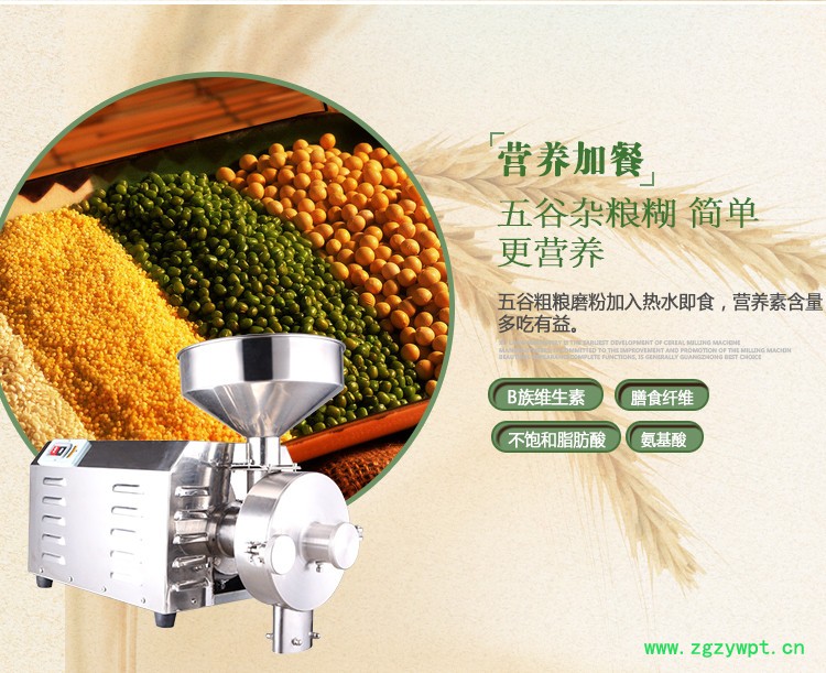 家用磨五谷杂粮粉机主要针对各种粮食:(芝麻、核桃、大米、黑米、黄豆、绿豆、花生、莲子、玉米、高粱、大麦、荞麦、燕麦等;)各种干性药材;(杏仁、茯苓、红枣、家芡实、枸杞、薏仁、山楂、淮山、首乌、红豆、阿胶、乳香、菟丝子、当归、党参、黄芪等)的磨粉,该机属连续投料式作业,结构简单大方,噪音小,容易操,粉碎细腻,无粉尘,适用于超市、商场、店铺档口现场加工各种五谷杂粮,和制药加工厂、医院诊所等加工中药材使用。
