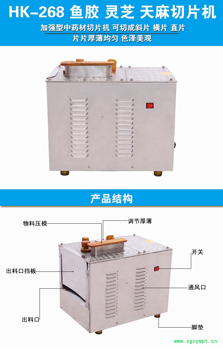 (4)刀片采用整体高速钢,经久耐用,切片范围广泛,如:黄芪、红参、三七、天麻、苏木、降香、生晒参、西洋参、 鹿尾、鹿茸、灵芝等均可切制。特别适 用于直径较大、或者需切长横状片的天麻、灵芝、鱼胶等药材、食品的切 片加工,以及大口径的淮山等的切片