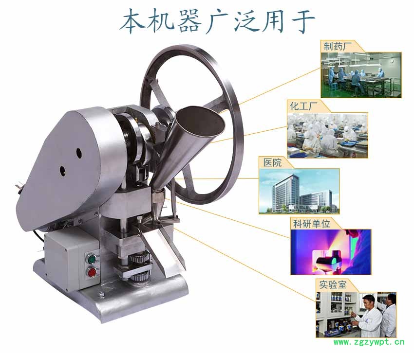 本机型性能优良,适应性强,使用方便,易于维修,体积小、重量轻,无电时也可手摇压片。本机只装一付冲模,物料的充填深度、压片厚度均可调节,能适应制药行业压制各种中、西药片剂的要求和其它行业压制各种类似产品的要求,深受各行业广大用户的欢迎。