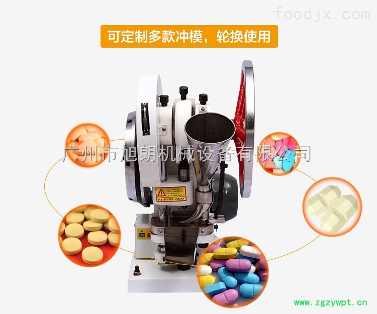 旭朗单冲压片机是一种小型台式电动连续冲压机(无电时也可手摇压片),能将各种颗粒状、晶体状或者流动性好的粉状原料压制成圆片状、圆柱状、球状、凸面、凹面和其他各种几何形状的产品(如方形、三角、椭圆、囊形等),还可压制带有文字、商标、图案的产品,适用于压制中药片剂、西药片剂、钙片、口含片、螺旋藻片、奶片、糖果片、泡腾片、咀嚼片、调味块、(卫生球)、芳香片、消毒片、催化剂、化肥片、农药片、纽扣电池、电子元件、冶金粉末陶瓷粒等。适合于制药、、食品、农业、化工、电子电池、冶金陶瓷等行业作为小批量生产和科研实验教学使用。本机只装一付冲模,物料的充填深度、压制厚度均可调节,也即是产品的重量、厚度及硬度均可调节,只要更换不同的模具可压制不同的产品。动力来源方便手摇,电动均可。本机价格低,体积小、操作简便,技术成熟,,价格优惠