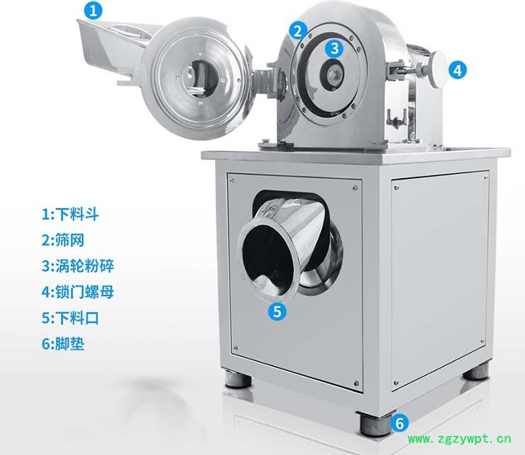本机配置: 1、标配斜斗,24以上型号可另外选购加配上料装置; 2、上料装置纯粹应用负压原理,由于粉碎腔里的涡轮盘高速运转,造成进料口的空气负压,进而将盛放在物料箱(或桶)里的物料(如小块物料、颗粒状物料或者粉状物料)吸进上料管道,然后进入粉碎腔进行粉碎; 3、客户如果不需要上料装置,可以将物料直接放置到斜斗里即可进行工作; 4、如果需要应用上料装置,可先将斜斗拆开,再将上料管带连接座的一端,用螺母固定到粉碎腔的盖板入口,另外一端放置到盛放物料的箱子或者桶里,箱子和桶由使用方根据需要进行配置。 工作原理:高能粉碎机利用涡轮盘带动活动刀片对物料进行撞击、剪切,以及物料与物料、物料与齿圈的撞击、摩擦进行交替粉碎。轮盘另增加了风叶装置,在工作中能产生强大风力,起到负压上料功能,并能带走腔体内大量的热量,并能及时补充外界的空气,从而大大提高了生产效率和产量。