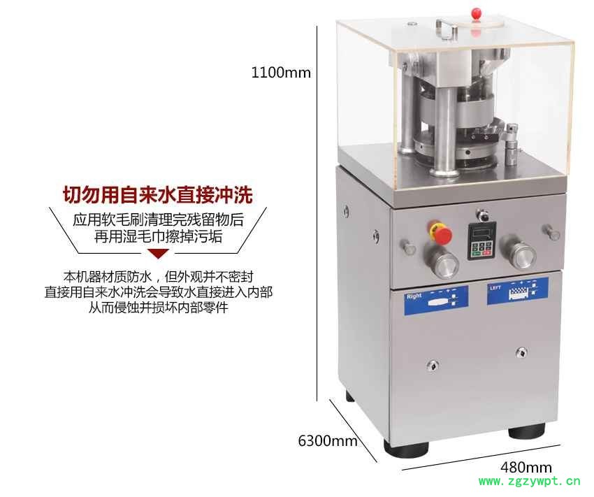 2、主要工作过程分为:⑴充填;⑵压片;⑶出片。三道程序连续进行,充填和压片有调节控制机构,附有表牌说明,操作简易。