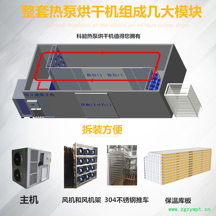 1、 主机:热泵烘干除湿机(热泵烘干机利用输入很少的电能吸收空气中的免费热量,用来烘干物料)