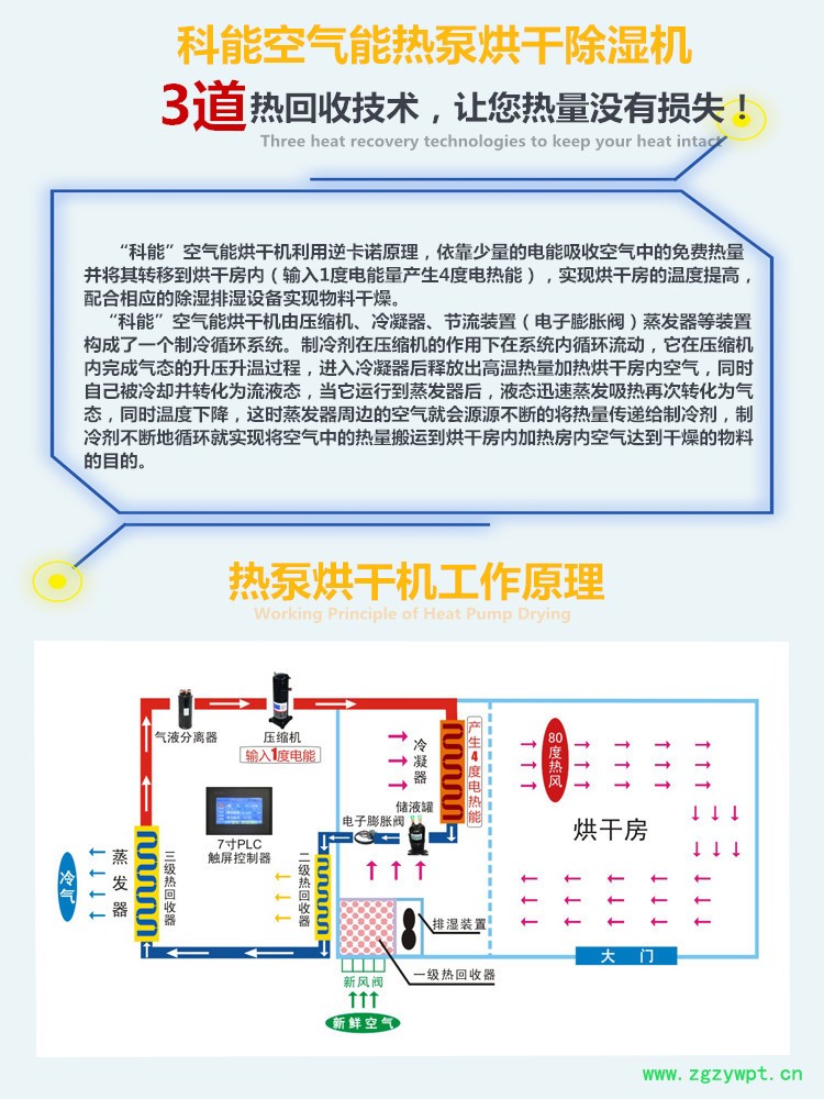 空气能热泵烘干机在而定的额工况下每消耗 1Kwh 电能为物料烘房提供 4Kwh 的热能,所以空气能热泵烘干机同批物料烘干能耗仅为传统烘干设备的1/4.