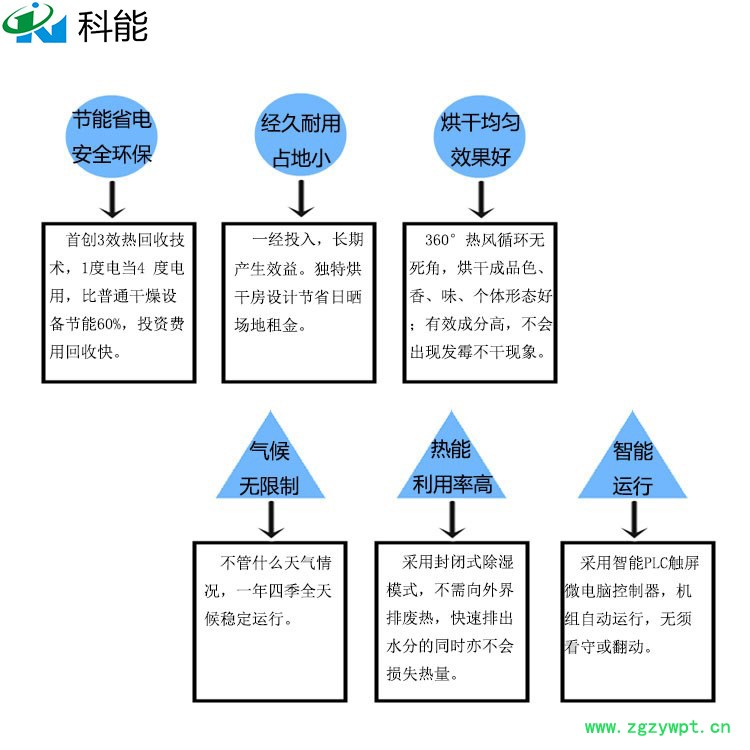 4、运行安全可靠:整个系统的运行无传统干燥器(燃油、燃气或电加热)中可能存在的易燃、易爆、中毒、短路等危险,是一种安全可靠的半封闭干燥系统。