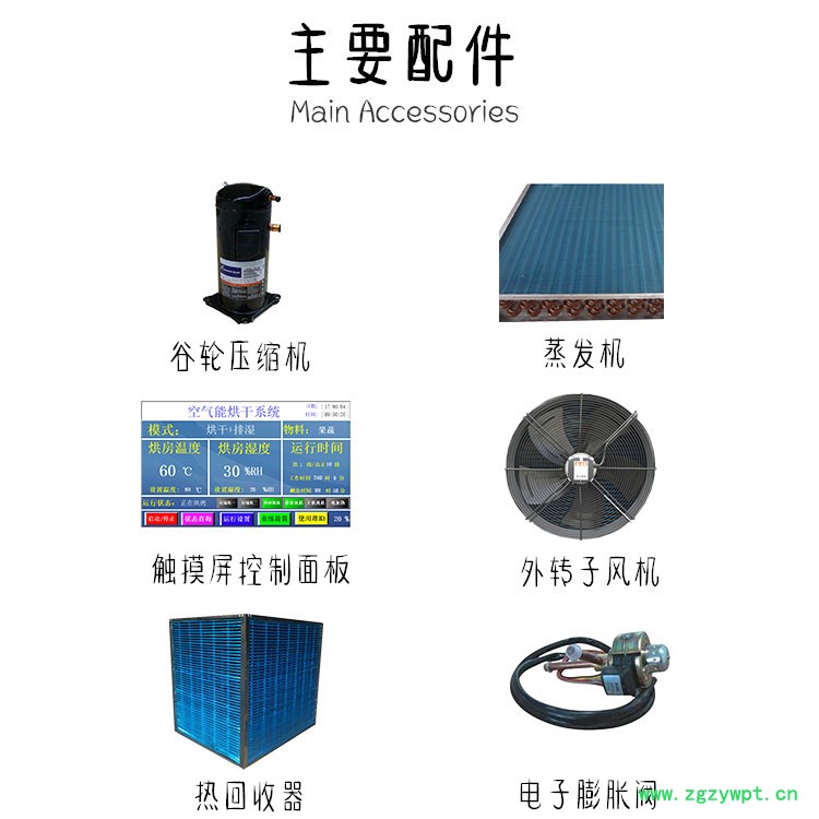 中药材热泵烘干系统的组成部分并不是很多,热泵与制冷的原理和系统设备组成及功能是一样的,主要由压缩机、蒸发器、触摸屏控制面板、外转子风机、热回收器和电子膨胀阀组成;