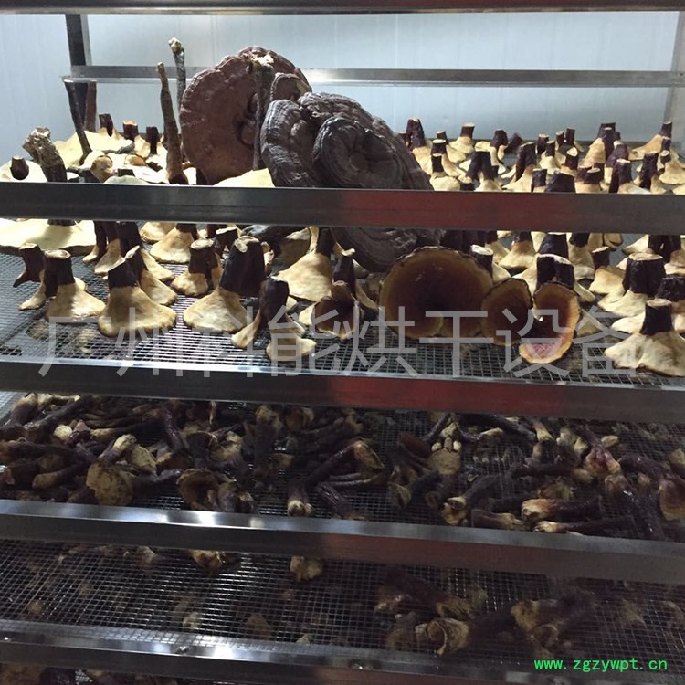 4、将灵芝烘干机的温度设置为中高温脱水干燥2-3小时,然后在60-70℃温度下脱水干燥8-12小时。整个灵芝烘干过程应一次完成,避免中间有间断。直至灵芝干燥至菌盖坚硬,含水量低于13%时结束,即可完成脱水干燥。若未完全干燥便终止干燥,灵芝易生霉、受虫蛀,且卖价很低;相反,如果过度干燥,则干芝生产率低,容易破碎良品率低。