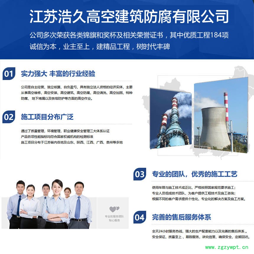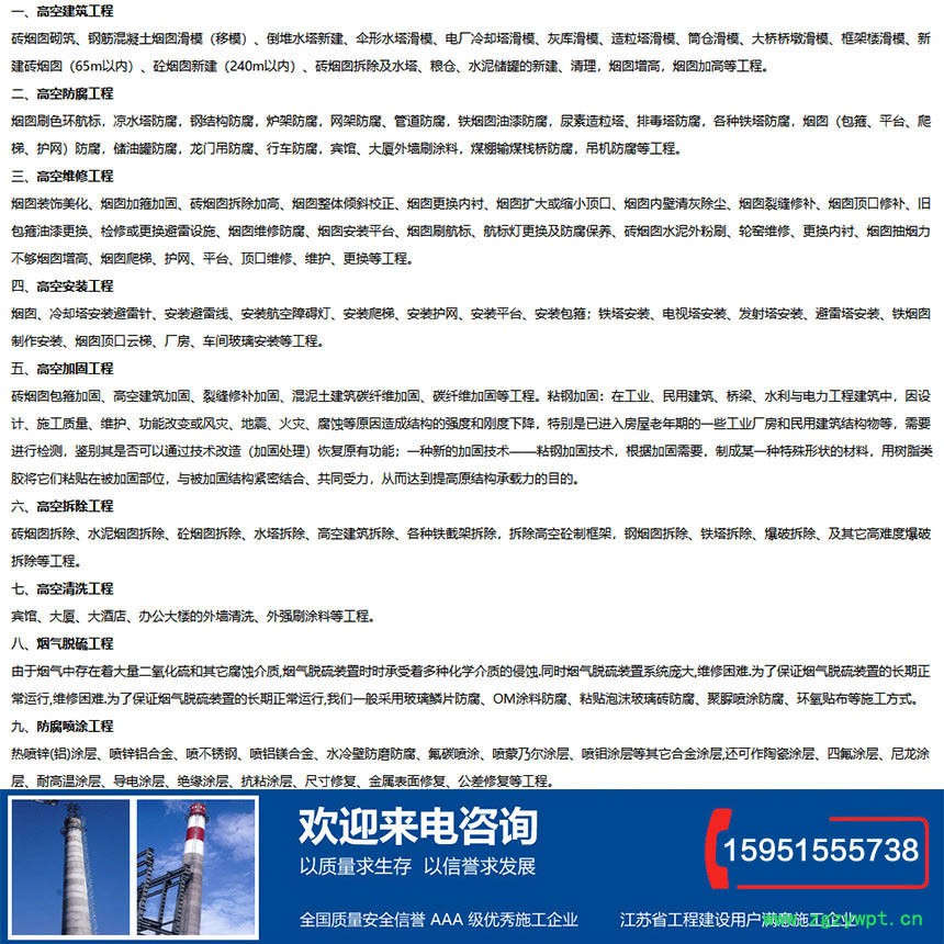 江苏浩久高空建筑防腐有限公司是一家具备高耸构筑物【浩久高空】砖砌烟囱防腐,杀菌防腐剂工程专业承包资质的施工企业。我公司多年来专业从事各种高空作业、高空建筑、高空维修、高空防腐、高空建构造物拆除安装,烟囱脱硫,防水堵漏,烟囱裂缝加固,拆除加高等工程。 由于我公司在施工中采取了的工艺和可靠的保障措施,使上述工程均“样板工程” “工程”,受到有关业主的高度评价。江苏浩久高空建筑防腐有限公司愿以多年来丰富的施工,各家业主服务,竭诚为广大用户提供满意、理想、优惠的产品。
