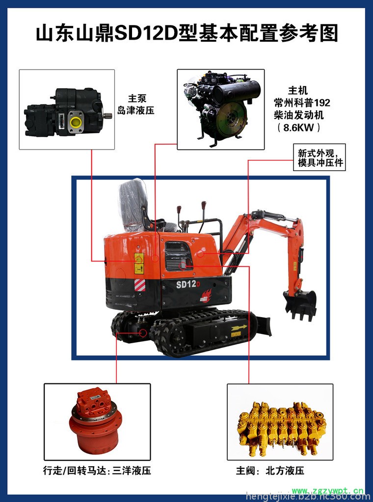 SD12D小型挖掘机基本配置:动力:常州科普机器(8.6千瓦);阀:辽宁北方多路阀;回转马达:中美伊顿;行走马达:中美伊顿。