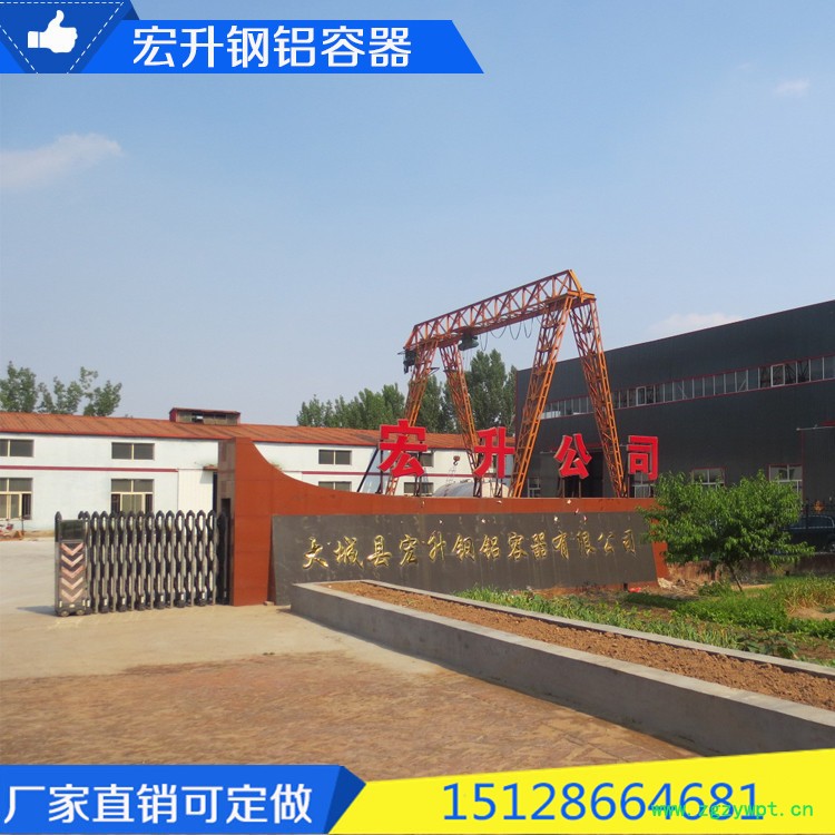 河北省大城县宏升钢铝容器有限公司是一家专业生产不锈钢罐、各种金属容器、化工容器的厂家。作为大型不锈钢罐制造厂家,制造经验丰富,拥有先进工艺技术和优良的焊接设备,公司主要生产各种规格的不锈钢罐、运输罐、保温罐,奶罐,储存罐、铝桶、啤酒桶、红酒发酵罐、纯净水设备和成套的制酒设备,规格齐全,质量上乘。具有投资省、强度高、重量轻、达到高强度的使用要求、价格低、质量好等优势。 公司产品采用优等材料制作而成、经久耐用、气密度试压可靠,在同类产品中价格低并注重售后服务,让您一次投资、百年受益,我公司技术力量雄厚产品质量可靠、现货供应、实行三包、代办托运,公司不锈钢罐等一系列产品自投放市场以来深受广大用户的青睐与好评。