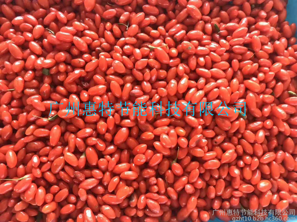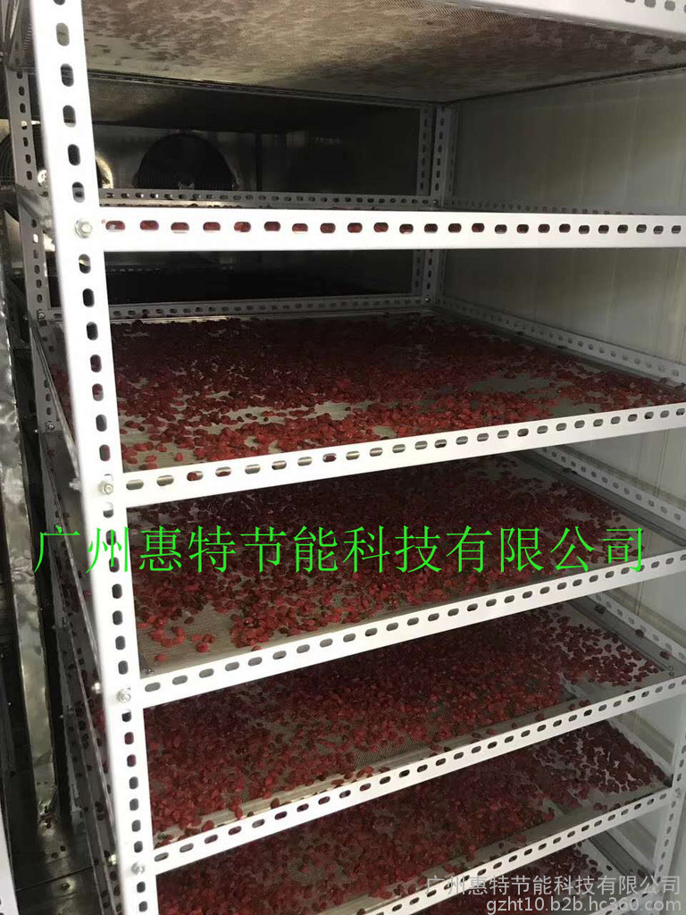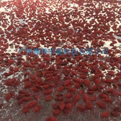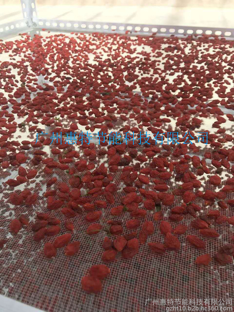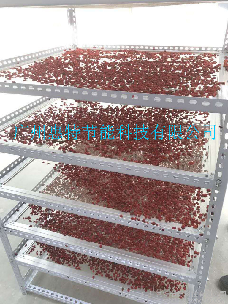 枸杞鲜果保质期极短,一般只有2~3天左右,所以在深加工时遇到的首要问题**是脱水保质的问题。目前,我国宁夏枸杞种植面积达50余万亩,而宁夏地区枸杞脱水加工储藏技术落后,90%以上枸杞采用自然摊晒法晒干加工,由于天气等原因每年损失约300元/亩,如遇到连天阴雨每亩损失超过千元。据宁夏的枸杞客户反馈:用一台15P枸杞烘干机,烘干2400斤,把鲜果摊放在本公司特制的网盘上,分为11-12层,每层间隔在14-15厘米左右,放置在烘干房内,分三段烘干。首先一段是四十度烘五个小时,第二段烘十八个小时,第三段是制冷一个小时,一共烘干24小时左右,即可完成烘干过程。烘干过程会除去的枸杞的水分在75%,物料实际得到质量在25%。