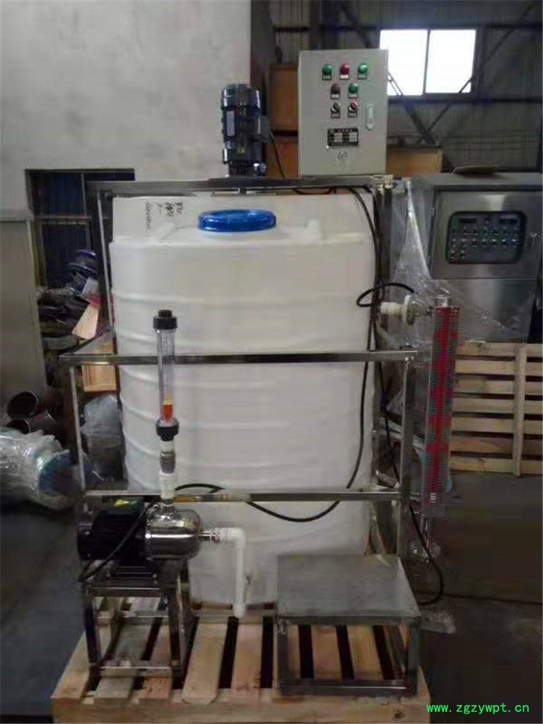 自动加药装置,主要有溶液箱、搅拌机、计量泵、Y型过滤器、安全阀、背压阀、止回阀、脉冲阻尼器、水位表、压力表、控制柜、安装平台等组成一体化安装在一个底座上。用户只需将组合式加药装置安放在加药间,将加药管接好接通电源即可启动投入运行,在运行过程中自动检测流体的酸碱度智能判断并加投相应的药液,这种工厂化的整套装置,可大大减少设计和现场施工的工作量,基本实现无人看管,对整机的质量、安全和现场投运提供了可靠的保证。
