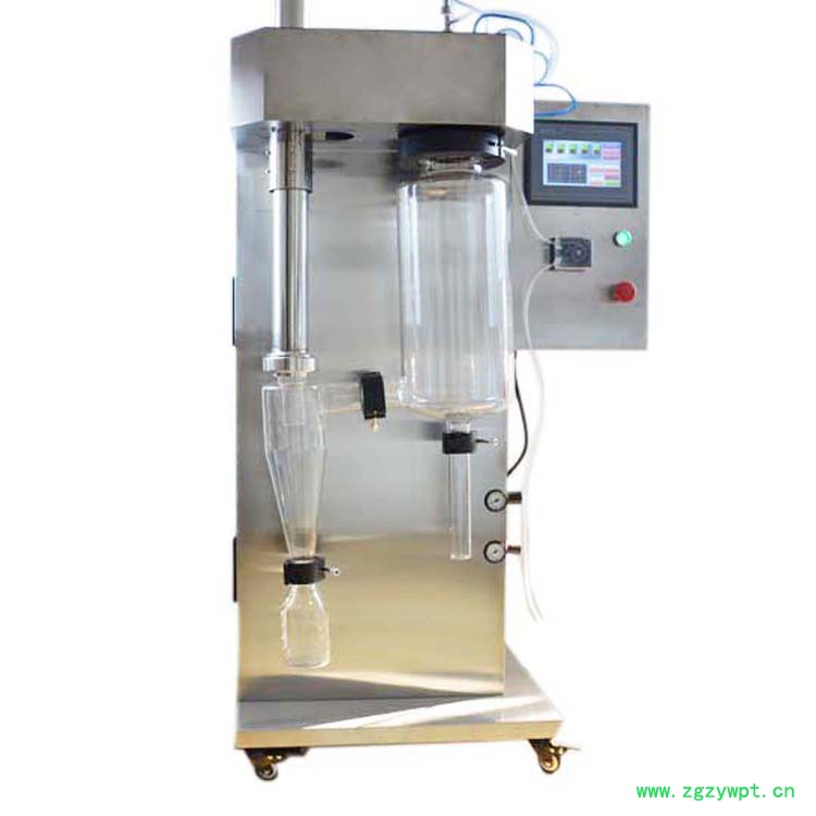 喷雾干燥机整机采用全不锈钢制作,二流体喷雾的雾化结构。喷雾、烘干及收集系统采用透明的高硼硅耐热玻璃材料制造,Z高可受热800℃